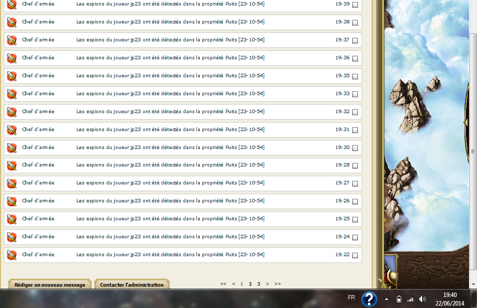 J'aurais besoin d'un petit coup de main de la communauté du jeu. Je ne sais plus quoi faire à la suite d'espionnages intempestifs c'est à dire toutes les minutes de la part du joueur jp23 durant ces absences. Certes j'ai pu obtenir ses horaires de connexion environ 6 h par jour donc 18 h d'espionnage toutes les minutes ce qui impliquent 1080 rapports d'espionnages. Ces espionnages durent depuis le 17 juin 2014. Vous comprendrez que je commence à en avoir un petit marre.