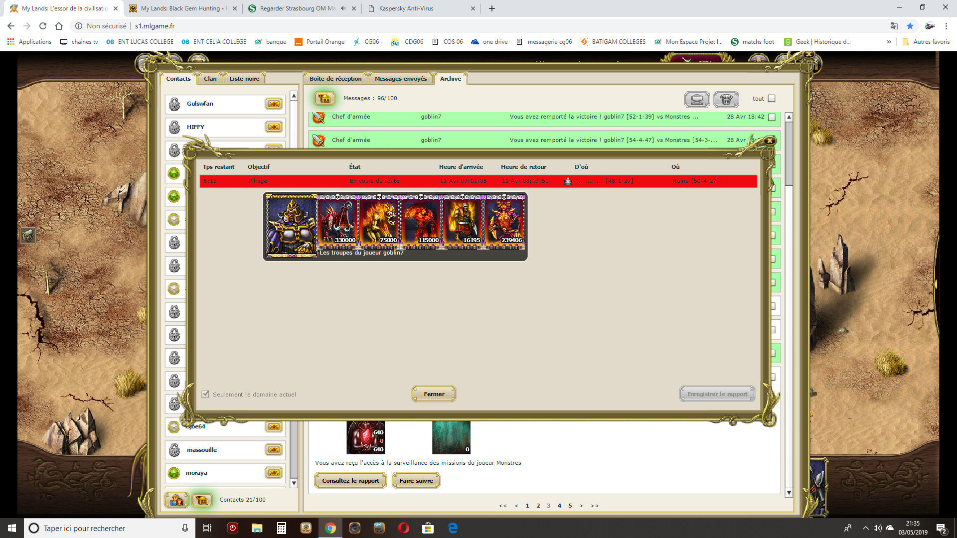 Monseigneur Goblin , comme chaque matin se leva vers les 5h du matin , au chant du coq . Il prit son café , alluma sa cigarette puis se mit à regarder les centaines de messages et rapports de ses explorateurs nocturnes. Il les lisait chaque fois qu il le pouvait puis les supprimer au fur et a mesure . Une fois fini , comme chaque matin il monta voir ses royaumes avec sa super-jumelle qui lui permettait de voir chaque recoin de chaque secteur du royaume . De voir ou se trouvait chaque ruine et ville , d en évaluer sa contenence et surtout de voir si des troupes se dirigeaient vers elles.
