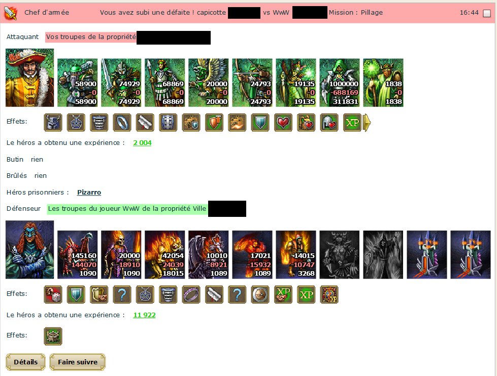 Ensuite, la prison est telle que même si tu avais gagné, ton héros aurait été capturé, en effet tu as perdu 60% de ton armée, donc tout dépend de la prison de WwW, mais si elle est plus de niveau 2, la chance de capture passe au dessus de 100% alors...