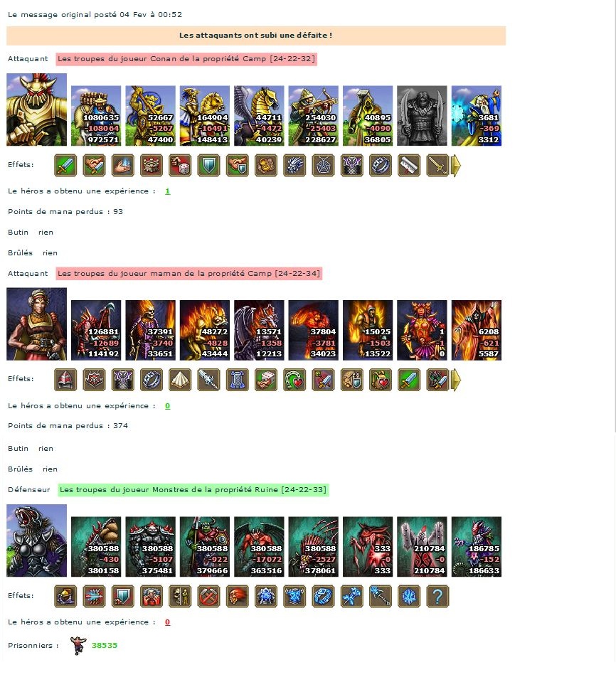 Mais l'archiruine en question était si terrible, qu'il était impossible d'en définir précisément la quantité de montres qu'elle abritait. Aussi Conan et Maman se consultèrent afin de déterminer de quelle façon éradiquer cette horreur. Ils burent des potions, revêtirent leurs plus puissantes armures, et foncèrent bravement au combat. L'issue demeura cependant incertaine, jusqu'au tout dernier moment. Les paysans, les fermiers, les enfants, tous regardèrent le combat, pas un seul d'entre eux ne put détourner les yeux, le coeur battant, espérant. Jusqu'à ce que la rage du combat cesse. Mon dieu... les monstres étaient victorieux. La nouvelle de la défaite se répandit rapidement aux alentours, à tout ceux qui n'avaient pu être témoins de cet enfer.