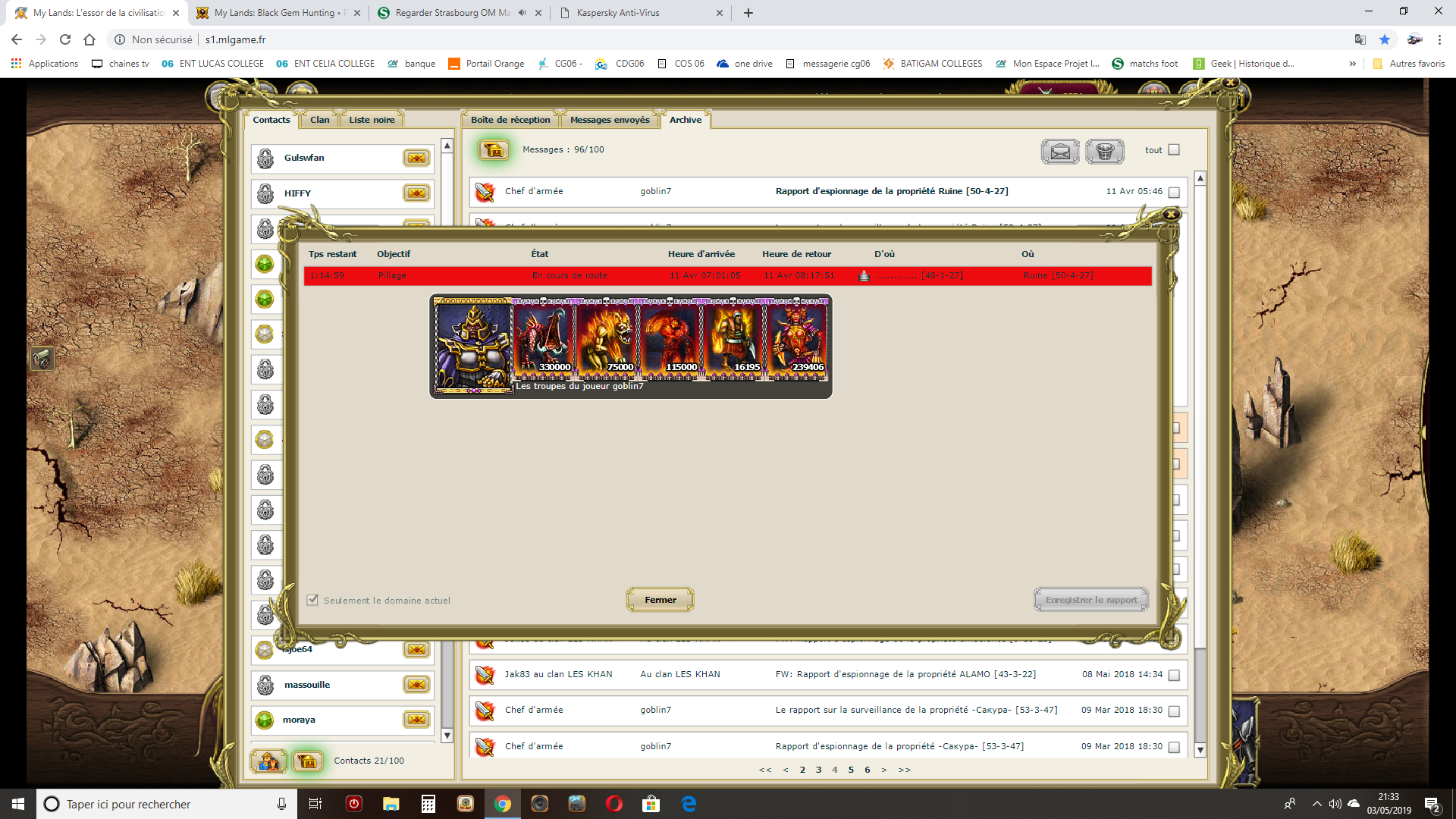 Retournons en à notre journée du 11 avril 2019 , le sieur Goblin était maintenant plus agé et plus aguerris qu'en 2014 . Son royaume était calme et prospère , ses armées dévelopées , ses explorateurs plus nombreux et plus organisés , ses secteurs plus calmes qu'à l'époque ( en effet beaucoup ont péris au combat ou on été réduits à partir loin des contrées mylandaises) , ses villes plus dévelopées et surtout l'harmonie régnait dans tout ce petit monde . Le maitre des lieux en aurait presque été réduit à se croire en préretraite .