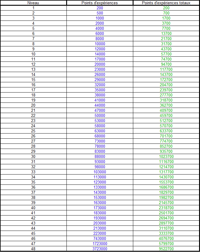 EDIT (à compléter): expérience nécessaire pour finir le niveau:
