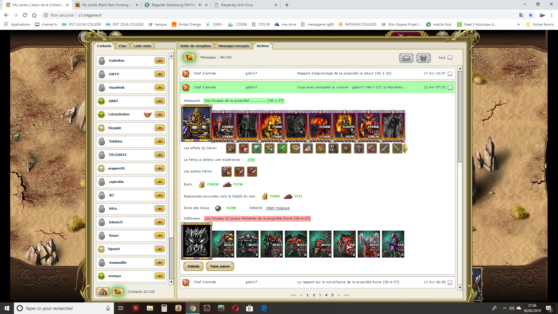 Retournons en à notre journée du 11 avril 2019 , le sieur Goblin était maintenant plus agé et plus aguerris qu'en 2014 . Son royaume était calme et prospère , ses armées dévelopées , ses explorateurs plus nombreux et plus organisés , ses secteurs plus calmes qu'à l'époque ( en effet beaucoup ont péris au combat ou on été réduits à partir loin des contrées mylandaises) , ses villes plus dévelopées et surtout l'harmonie régnait dans tout ce petit monde . Le maitre des lieux en aurait presque été réduit à se croire en préretraite .