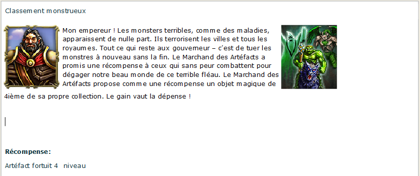 Mon empereur ! Les monsters terribles, comme des maladies, apparaissent de nulle part. Ils terrorisent les villes et tous les royaumes. Tout ce qui reste aux gouverneur – c’est de tuer les monstres à nouveau sans la fin. Le Marchand des Artéfacts a promis une récompense à ceux qui sans peur combattent pour dégager notre beau monde de ce terrible fléau. Le Marchand des Artéfacts propose comme une récompense un objet magique de 4ième de sa propre collection. Le gain vaut la dépense !