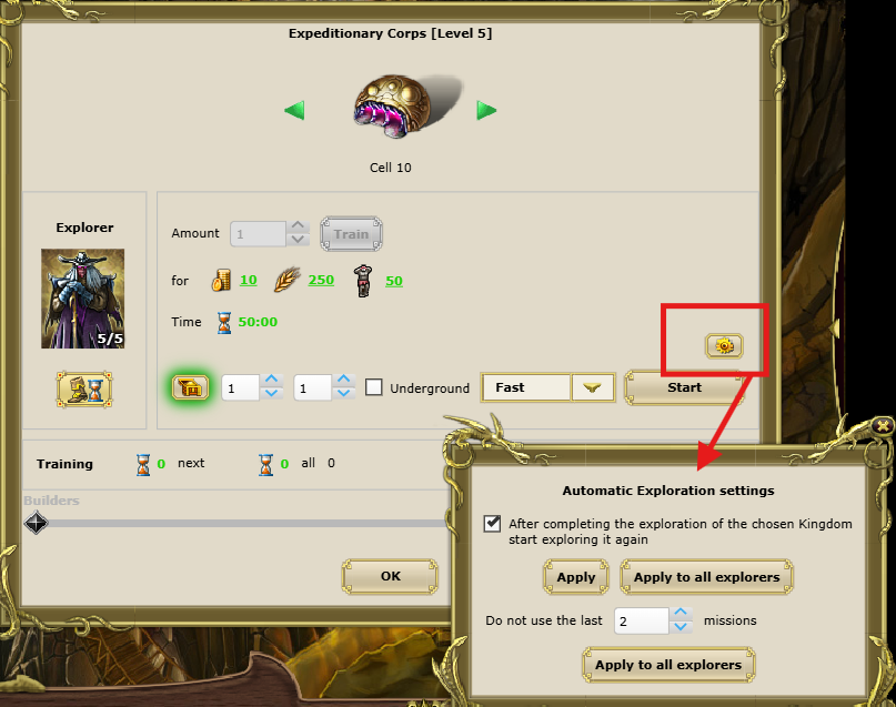 2. Check the box for continuous exploration "After completing exploration of the selected kingdom, start exploring it again". Such settings can be applied both for individual Expedition Corps (button "Apply") and for all such buildings in all possessions, simply by clicking the "Apply to all explorers" button